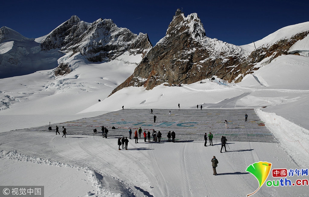 一張面積約2500平方米的世界最大明信片16日在瑞士少女峰下正式亮相,旨在喚起人們對(duì)全球氣候變化的關(guān)注。這張明信片的尺寸打破吉尼斯紀(jì)錄。新華社記者徐金泉攝