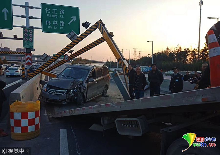 2018年11月19日下午,鄭州市西三環(huán)化工路立交橋,沿西三環(huán)由北向南方向上橋口處,一輛商務(wù)面包車(chē)失控撞塌了3米限高架,橋上交通瞬間中斷。 圖片來(lái)源:視覺(jué)中國(guó)