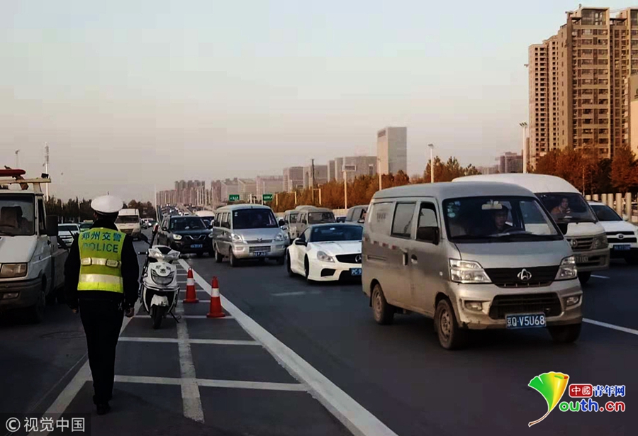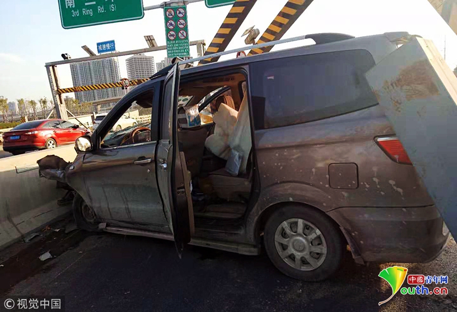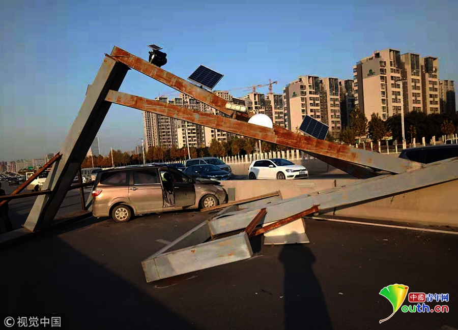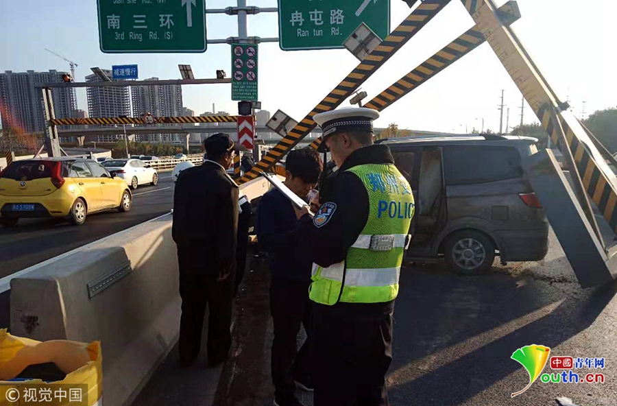 2018年11月19日下午,鄭州市西三環(huán)化工路立交橋,沿西三環(huán)由北向南方向上橋口處,一輛商務(wù)面包車失控撞塌了3米限高架,橋上交通瞬間中斷。 圖片來(lái)源:視覺中國(guó)
