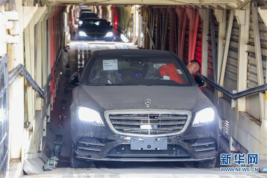 11月19日,在首趟中歐班列商品車專用車運(yùn)輸國(guó)際班列的車廂內(nèi),工作人員駕駛著進(jìn)口整車進(jìn)行卸貨作業(yè)。 新華社記者 劉潺 攝