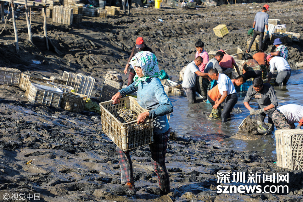 深圳新聞網(wǎng)訊 2018年9月8日,遼寧丹東,早上5點,挖蟶人紛紛下到各個池子,要在海水海泥里艱辛勞作10小時,直至下午3點集體上岸,等待買家的運輸車隊運走他們的勞動成果。9月初,遼寧沿海養(yǎng)殖區(qū)進入養(yǎng)殖海鮮的收獲季。在東港,常常出現(xiàn)數(shù)百人乃至上千人集結(jié)在池子里挖蟶子(這里特指縊蟶,即東港當(dāng)?shù)厝怂f的小人仙。下同)的壯觀景象。在養(yǎng)殖海鮮的收獲季,成群的海鷗趁機“助陣“,人與大自然和諧共處的畫面令人嘆為觀止。