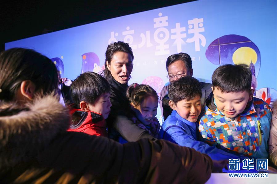 11月20日,在北京舉行的世界兒童日主題活動上,聯(lián)合國兒童基金會大使陳坤與孩子們共同點亮國家游泳中心。 新華社記者張玉薇攝