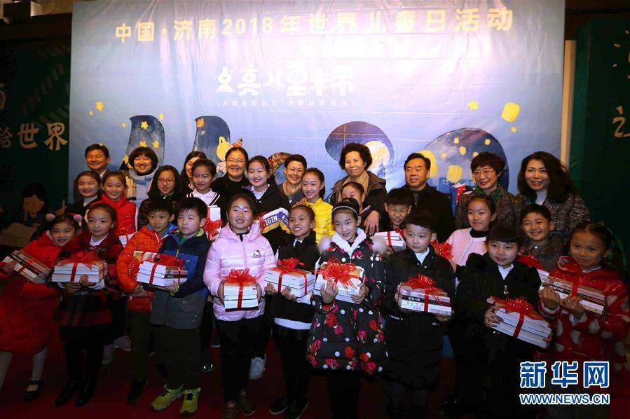 11月20日,在濟南舉行的世界兒童日主題活動上,孩子們拿著獲贈的經(jīng)典書籍合影留念。 新華社發(fā)(李俊卓攝)