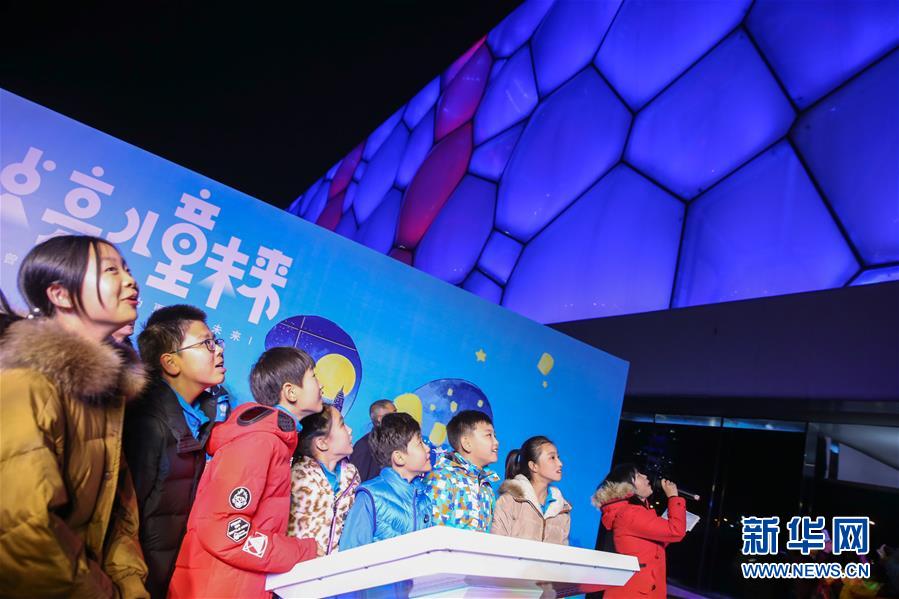 11月20日,在北京舉行的世界兒童日主題活動上,國家游泳中心外墻被點亮。 新華社記者張玉薇攝