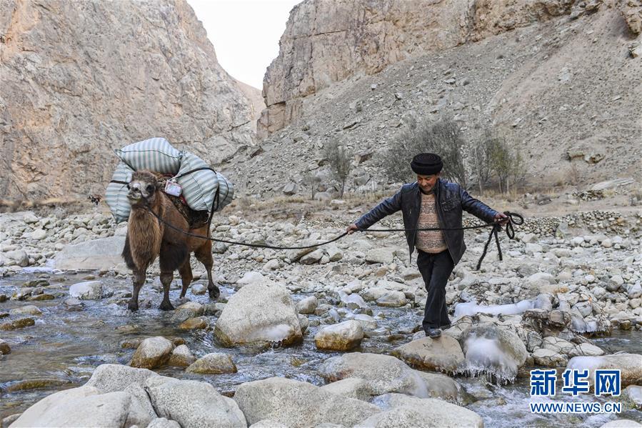 在去往阿克托尕欄桿村村委會(huì)的路上,都熱·加爾曼牽著馱有行李的駱駝通過(guò)山間河流(11月17日攝)。新華社記者胡虎虎攝