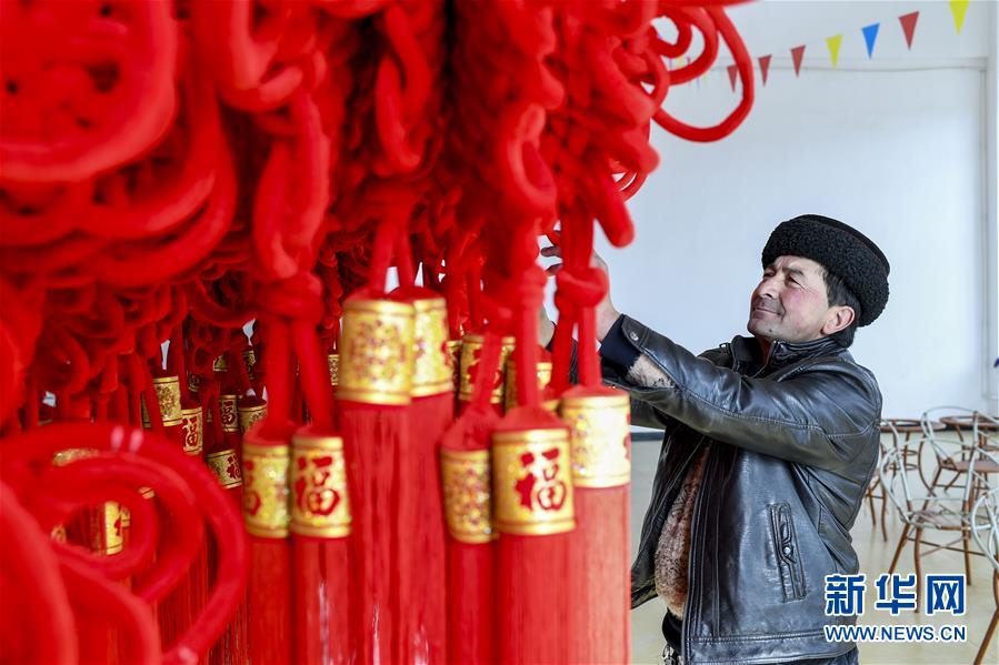 在塔什庫(kù)爾干塔吉克自治縣塔提庫(kù)力易地扶貧搬遷安置點(diǎn)的衛(wèi)星工廠,都熱·加爾曼在參觀由村民編制的手工藝品(11月18日攝)。新華社記者胡虎虎攝