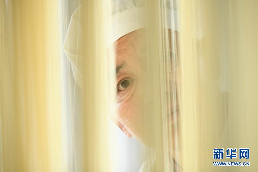 11月23日,在石家莊市藁城區(qū)耿家莊村某宮面生產(chǎn)廠,工人演示用藁城宮面穿過(guò)縫針眼。