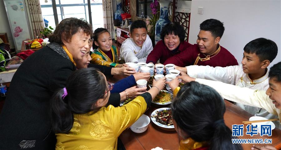 11月16日,南昌市第十七中學西藏班的學生來到劉和平(后排右四)家中吃飯。新華社記者 胡晨歡 攝