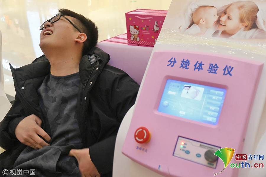2018年3月8日,一名男士在山東煙臺大悅城通過“分娩體驗(yàn)儀”感受“分娩”時的陣痛。