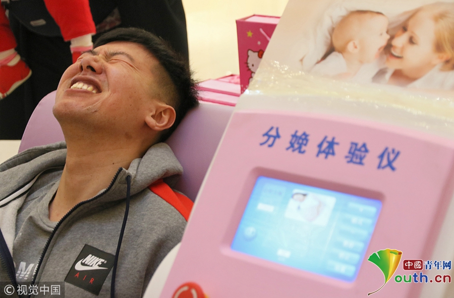 2018年3月8日,一名男士在山東煙臺大悅城通過“分娩體驗(yàn)儀”感受“分娩”時的陣痛。