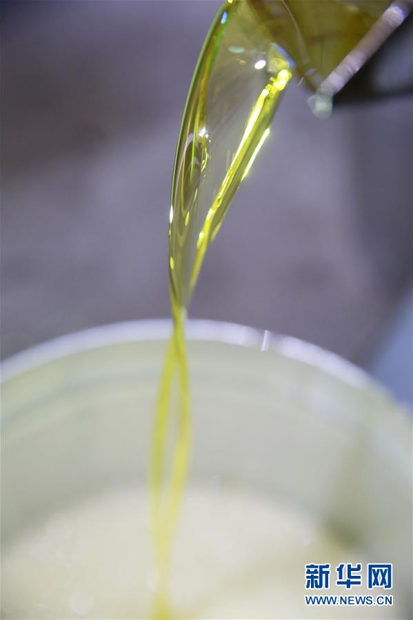 11月22日,在廣西柳州三江侗族自治縣斗江鎮(zhèn)一茶油加工點(diǎn),新榨的茶油從榨油機(jī)流出。新華社記者任正來(lái)攝