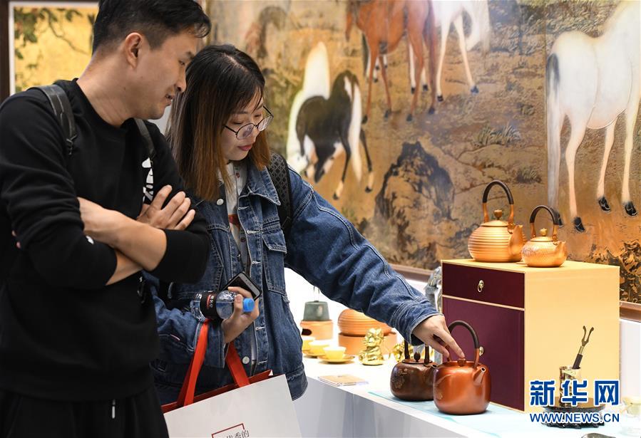 11月23日,兩位參觀者在“博博會(huì)”上觀看文創(chuàng)產(chǎn)品。新華社記者李賀攝