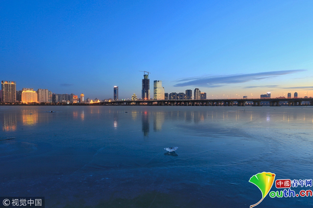 11月23日,黑龍江省哈爾濱市,松花江城區(qū)江段今日封江,江面如鏡,倒影著冰城靚麗的夜色。