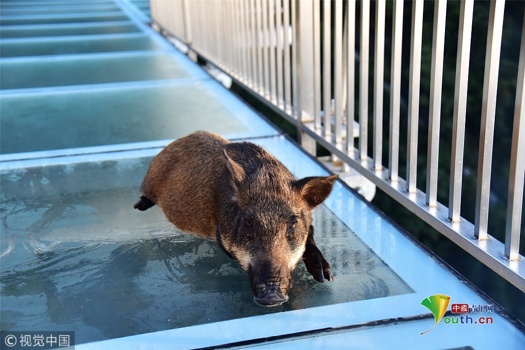 小野豬誤入玻璃橋嚇得發(fā)抖保安解救 豬:你們?nèi)祟愄膳铝?/h1>