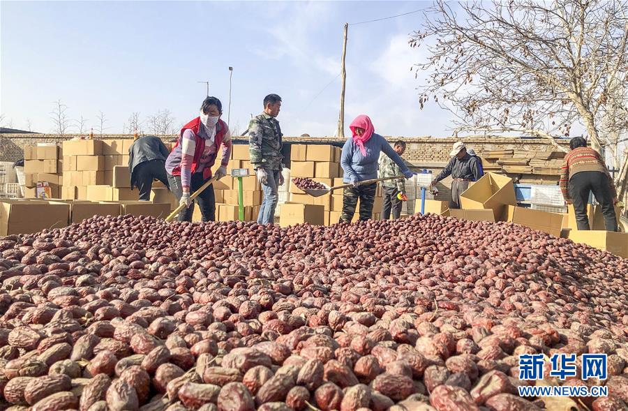 拜什托格拉克鄉(xiāng)伊斯勒克墩村村民將晾曬好的紅棗裝箱(11月29日攝)。 新華社記者 關俏俏 攝