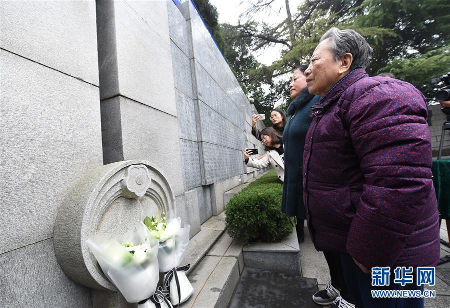 12月3日,南京大屠殺幸存者石秀英(右)率家屬在死難者名單墻前憑吊被侵華日軍殺害的親人。 當(dāng)日,在第五個南京大屠殺死難者國家公祭日到來之際,南京大屠殺死難者遺屬家祭活動在侵華日軍南京大屠殺遇難同胞紀念館正式啟動。首批前來開展家祭活動的南京大屠殺幸存者余昌祥、石秀英老人分別率家屬在紀念館內(nèi)的死難者名單墻前獻花、敬香、跪拜,并誦讀家信,表達對親人的哀思。 新華社記者 孫參 攝
