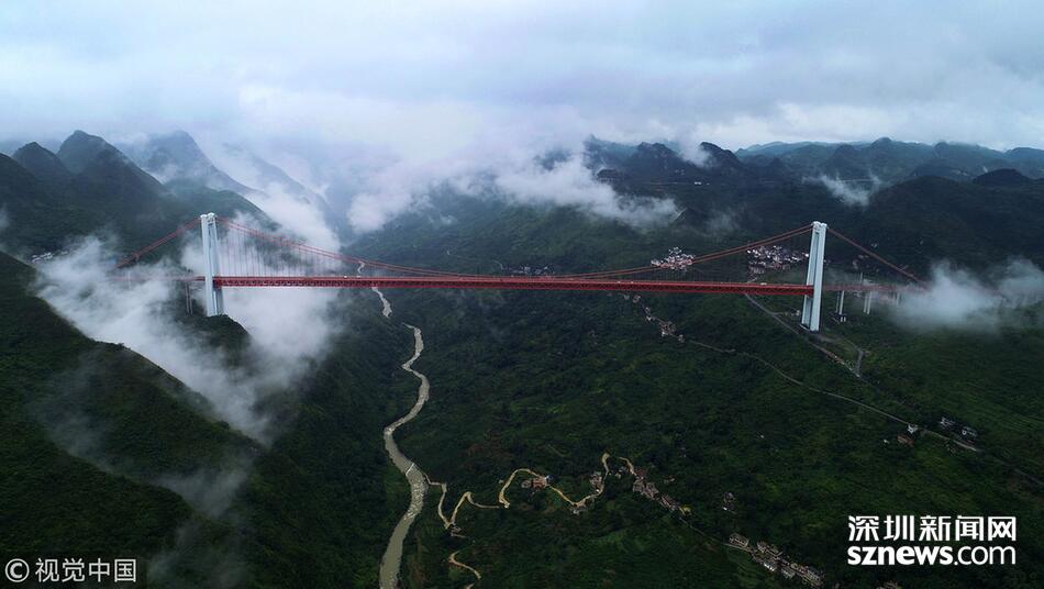 當(dāng)日,杭瑞高速貴州省畢節(jié)至都格(黔滇界)公路北盤(pán)江大橋上云霧繚繞,美景如畫(huà)。北盤(pán)江大橋主橋跨徑720米,橋面到谷底垂直高度565米。