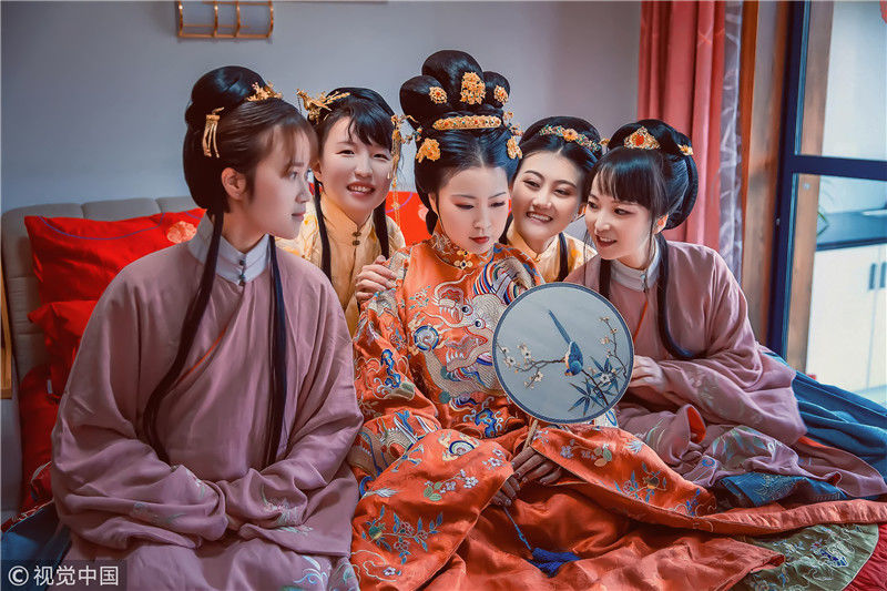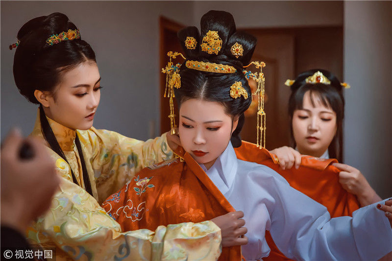 2018年11月18日,浙江嘉興。女孩黃聰今年30歲,是浙江省海寧市硤石人,是一位對(duì)漢文化情有獨(dú)鐘的個(gè)性女孩。對(duì)于這一次的漢婚大禮的每一個(gè)細(xì)節(jié),都非常仔細(xì)。小到發(fā)簪首飾,大到日常禮儀。說(shuō)起為什么會(huì)舉辦這樣一場(chǎng)古風(fēng)婚禮,她說(shuō)自己從2013年戀上漢服,就下了這個(gè)決定。