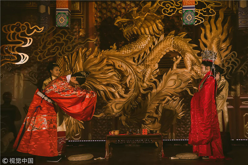 2018年11月18日,浙江嘉興。婚禮開始,隨著一聲“新婿、新婦正婚大典開禮!掌燈!”兩名侍女提宮燈在前面開道,兩名執(zhí)事手捧大雁跟隨,然后是新人緊隨。新人身后是兩侍女手持沃盥用具,兩執(zhí)事持裝肉的食盤、酒壺,走在最后面。
