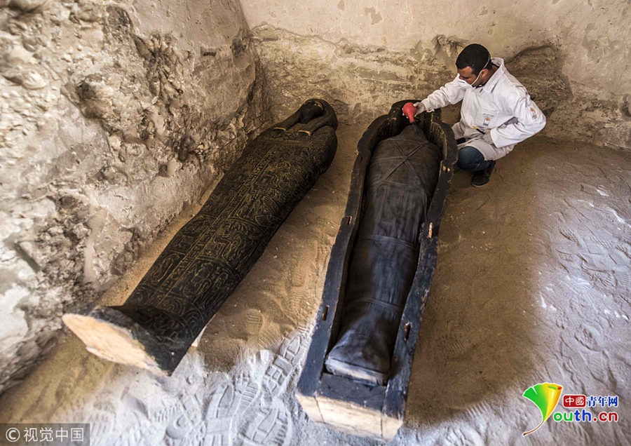 當(dāng)?shù)貢r間2018年11月24日,埃及盧克索,考古學(xué)家在當(dāng)?shù)匕l(fā)掘出一處墓穴,在其中發(fā)現(xiàn)石棺、木乃伊等文物,時間可追溯至公元前4-7世紀。