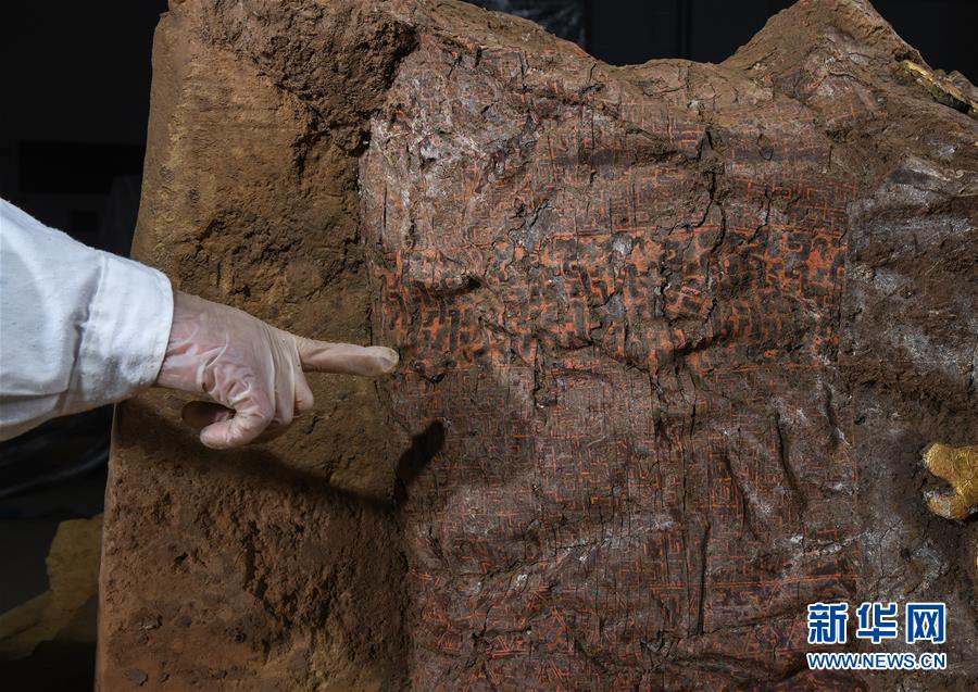這是在位于河北行唐的考古實驗室內(nèi)拍攝的裝飾有繁復(fù)髤漆彩繪圖案的車廂遺存(12月4日攝)。新華社記者 李賀 攝