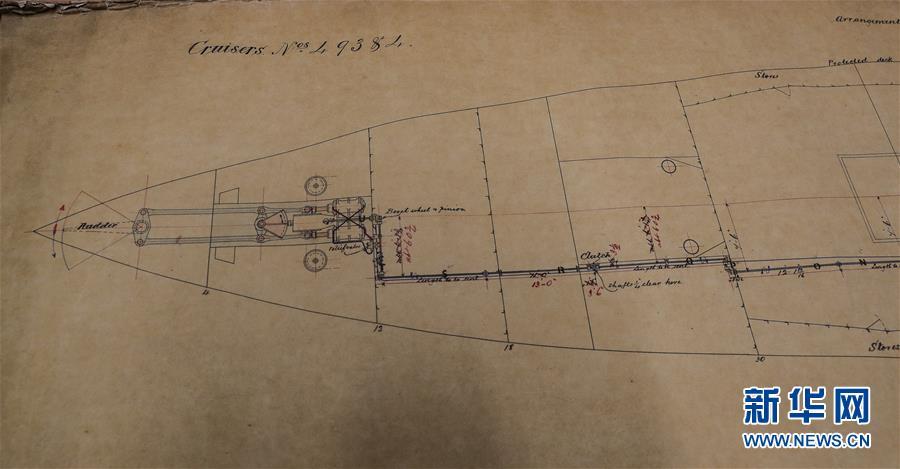 這是11月2日在英國紐卡斯?fàn)柕奶┒鳌枡n案館拍攝的致遠(yuǎn)艦設(shè)計(jì)圖紙。 新華社記者日前在紐卡斯?fàn)柼┒鳌枡n案館查找北洋海軍史料時發(fā)現(xiàn)一套七張、檔案名為“中國巡洋艦舵機(jī)設(shè)計(jì)圖”的原始圖紙。塵封百年,甲午海戰(zhàn)中抗擊日艦后沉沒的清北洋海軍致遠(yuǎn)艦部分原廠設(shè)計(jì)圖紙?jiān)谄浣ㄔ斓亍~卡斯?fàn)柺械囊患覚n案館首次被發(fā)現(xiàn),為打撈那段悲壯的歷史提供了重要參考。 新華社記者 韓巖 攝