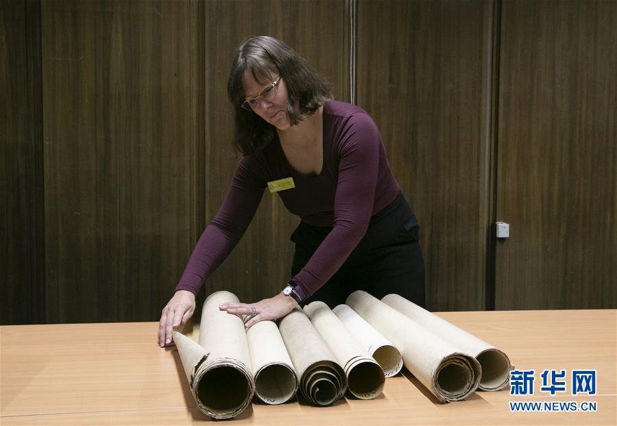 11月2日,在英國紐卡斯?fàn)柕奶┒鳌枡n案館,檔案管理員瑞秋·吉爾介紹致遠(yuǎn)艦設(shè)計(jì)圖紙。 新華社記者日前在紐卡斯?fàn)柼┒鳌枡n案館查找北洋海軍史料時發(fā)現(xiàn)一套七張、檔案名為“中國巡洋艦舵機(jī)設(shè)計(jì)圖”的原始圖紙。塵封百年,甲午海戰(zhàn)中抗擊日艦后沉沒的清北洋海軍致遠(yuǎn)艦部分原廠設(shè)計(jì)圖紙?jiān)谄浣ㄔ斓亍~卡斯?fàn)柺械囊患覚n案館首次被發(fā)現(xiàn),為打撈那段悲壯的歷史提供了重要參考。 新華社記者 韓巖 攝