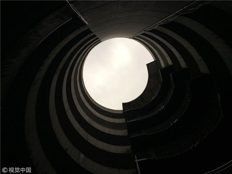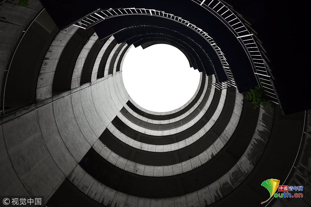2017年9月27日,重慶,南岸區(qū)某小區(qū)的“螺旋”停車場(chǎng),從公路到車庫(kù)要下5層樓,司機(jī)需要轉(zhuǎn)無(wú)數(shù)個(gè)360度圈。圖片來(lái)源:視覺(jué)中國(guó)