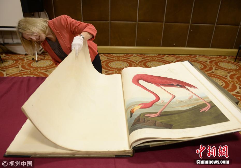 2018年12月12日消息,英國格拉斯哥,世界上最貴的印刷書——美國鳥類學家、畫家和博物學家詹姆斯·奧杜邦手繪的第一版《美國鳥類》被罕見取出米切爾圖書館保險庫公開亮相。圖片來源:視覺中國