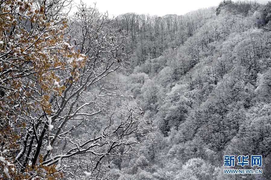 鬼谷嶺國(guó)家森林公園山頂白雪覆蓋,半山卻是一派秋色(11月8日拍攝)。 新華社記者陶明攝