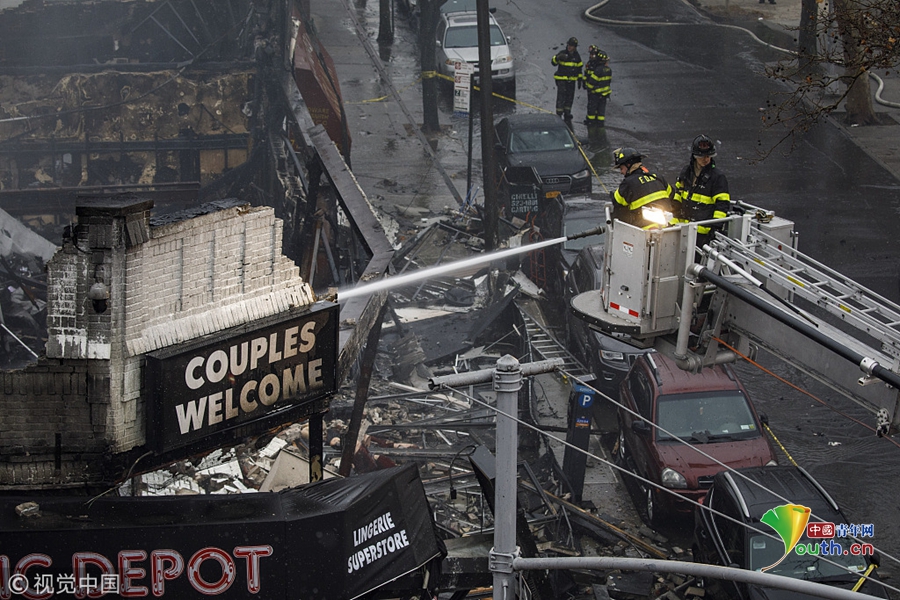 當(dāng)?shù)貢r間2018年12月13日,美國紐約,在紐約皇后區(qū)皇后大道,一場大火吞噬了六家商鋪,消防隊員正在努力撲滅火災(zāi)余燼。十幾人受傷,包括6名消防員。起火原因仍在調(diào)查中。圖片作者:Drew Angerer