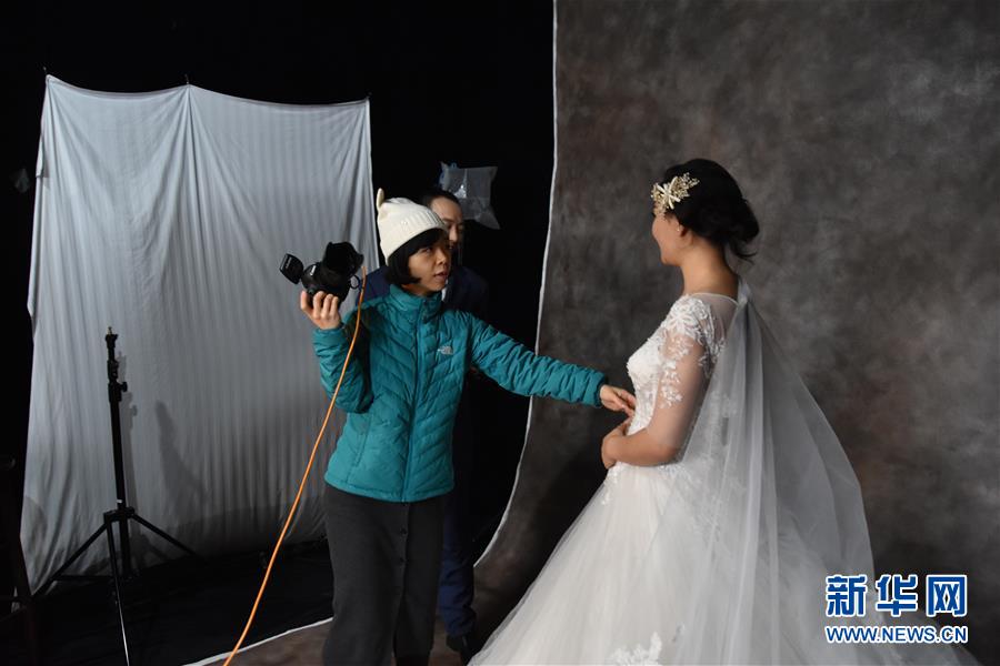 攝影師羅嫻為農(nóng)民工夫妻拍攝婚紗照(12月10日攝)。 新華社記者 白田田 攝