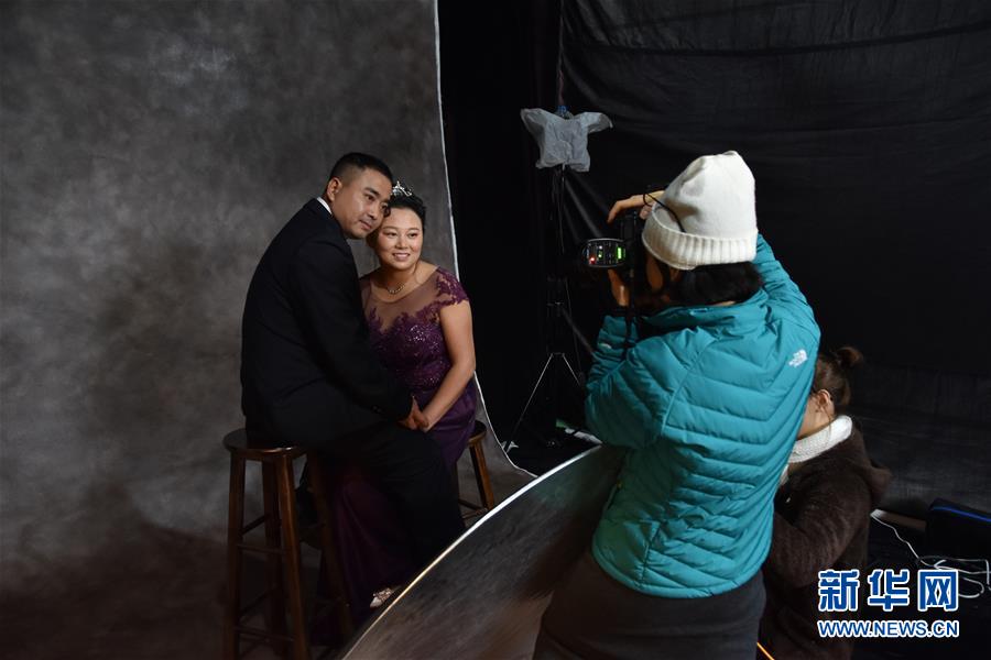 攝影師羅嫻在工地上搭建的臨時(shí)攝影棚內(nèi)指導(dǎo)農(nóng)民工夫妻擺姿勢(shì)(12月10日攝)。 新華社記者 白田田 攝