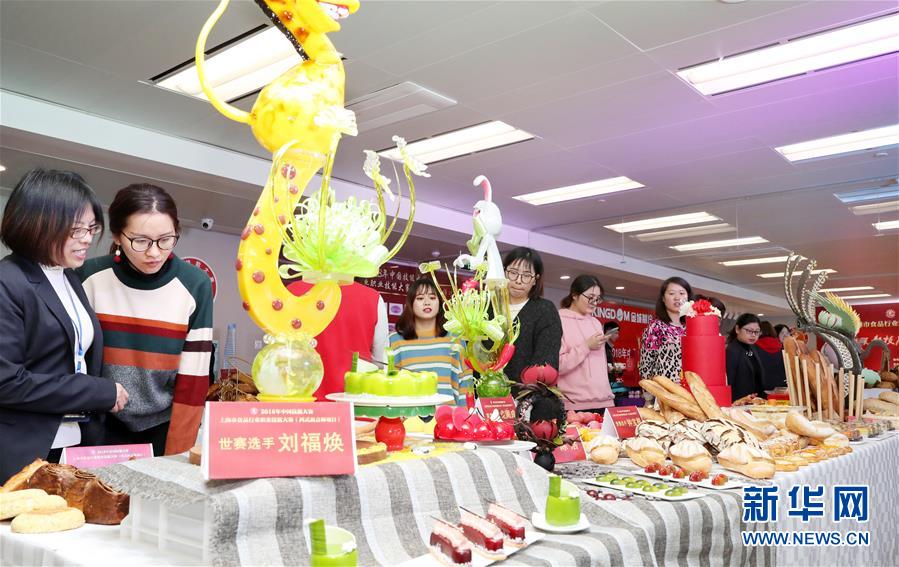 12月13日,參觀者在烘焙和糖藝成品展示現(xiàn)場參觀。 當日,2018年中國技能大賽——上海市食品行業(yè)職業(yè)技能競賽(西式面點師項目)在上海環(huán)球港舉行?;顒臃譃楦傎惡驼故緝刹糠?,近400名選手參加競賽部分比拼,最終進入決賽的25名選手的作品在現(xiàn)場進行展示評比。 新華社記者 方喆 攝