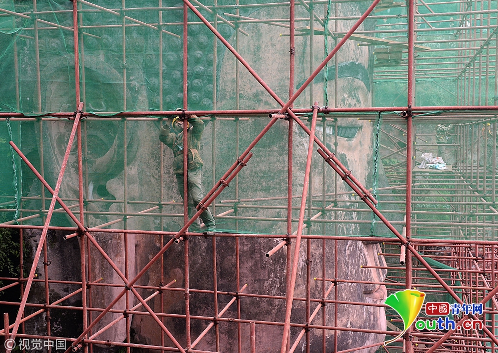12月10日前后已逐步遮蔽大佛頭部,對(duì)頭面部進(jìn)行勘測;12月底將開始拆除頭部腳手架,保證2019年元旦節(jié)之前,先露出佛頭,供游客觀賞。