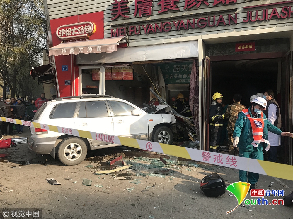 2018年12月14日上午10時(shí)左右,在鄭州市中原區(qū)淮河路與工人路交叉口發(fā)生一起交通事故。一輛白色SUV轎車在撞上一輛電動自行車后沖入沿街一包子店,事故造成1人死亡,8人受傷。據(jù)鄭州市交巡警二大隊(duì)通報(bào),目前,59歲的肇事司機(jī)陳某已被警方控制,傷者送醫(yī)救治,事故正在進(jìn)一步調(diào)查。圖為交警在事發(fā)地點(diǎn)處理事故。