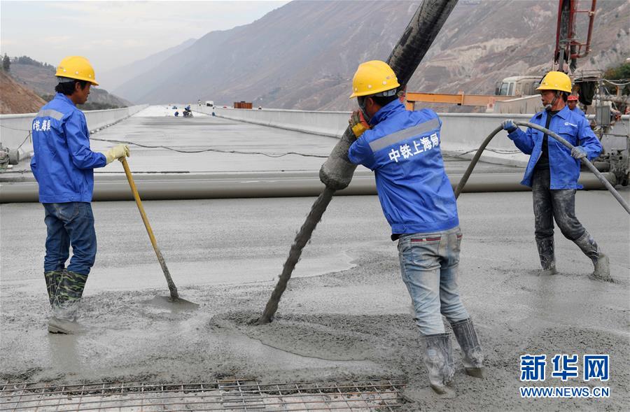 12月15日,中鐵上海局集團公司的施工人員在東格高速公路土建項目中進行橋面鋪裝作業(yè)。新華社記者楊宗友攝