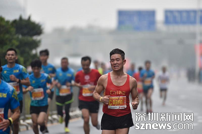 2018年12月16日,深圳國際馬拉松位于后海的折返點,一名身著中國字樣背心的選手正向終點沖刺。