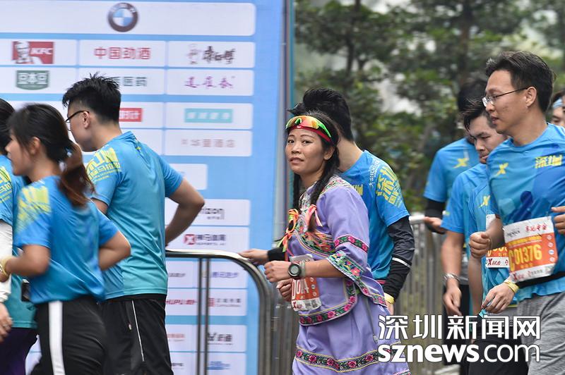 2018年12月16日,深圳國際馬拉松位于后海的折返點(diǎn),一名身著民族傳統(tǒng)服裝的選手正在向終點(diǎn)沖刺。