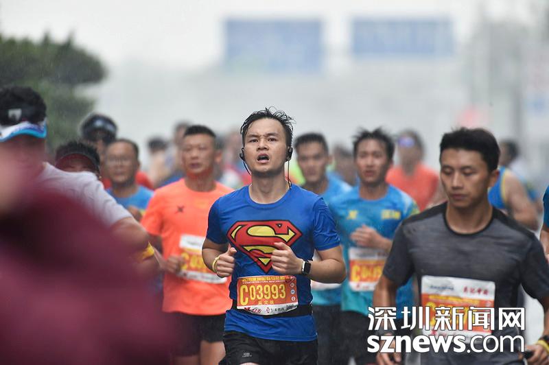 2018年12月16日,深圳國際馬拉松位于后海的折返點,一名身著超人標(biāo)志短袖選手正在向終點沖刺。