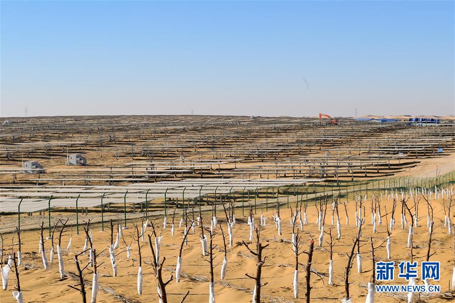 位于庫布其沙漠腹地的達(dá)拉特光伏發(fā)電應(yīng)用領(lǐng)跑基地一期500兆瓦項目(12月13日攝)。