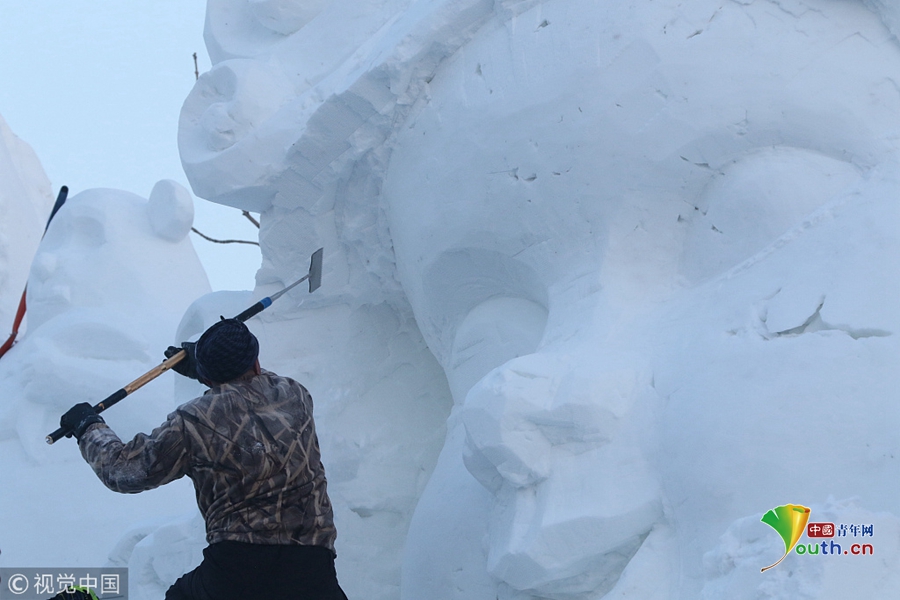 2018年12月13日,黑龍江省哈爾濱市,國(guó)內(nèi)最大的雪雕盛會(huì)太陽(yáng)島雪博會(huì)正在緊鑼密鼓建設(shè)中,部分雪雕雛形已現(xiàn),雪雕師正在精雕細(xì)刻打磨中。