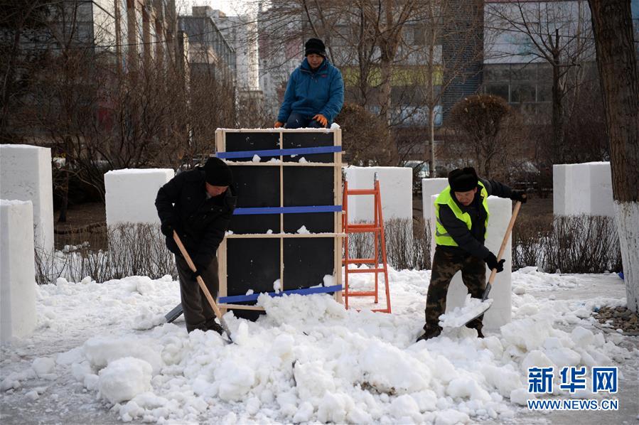 12月17日,工人們?cè)谒苫ń鲜占K,準(zhǔn)備制作雪雕作品。新華社記者王凱攝