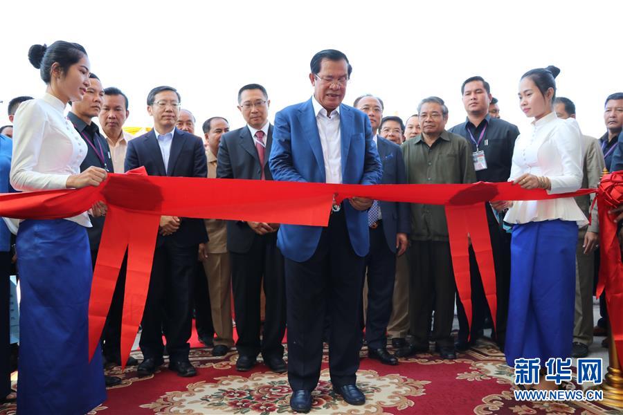12月17日,柬埔寨首相洪森(中)在上丁省參加桑河二級(jí)水電站竣工投產(chǎn)儀式。