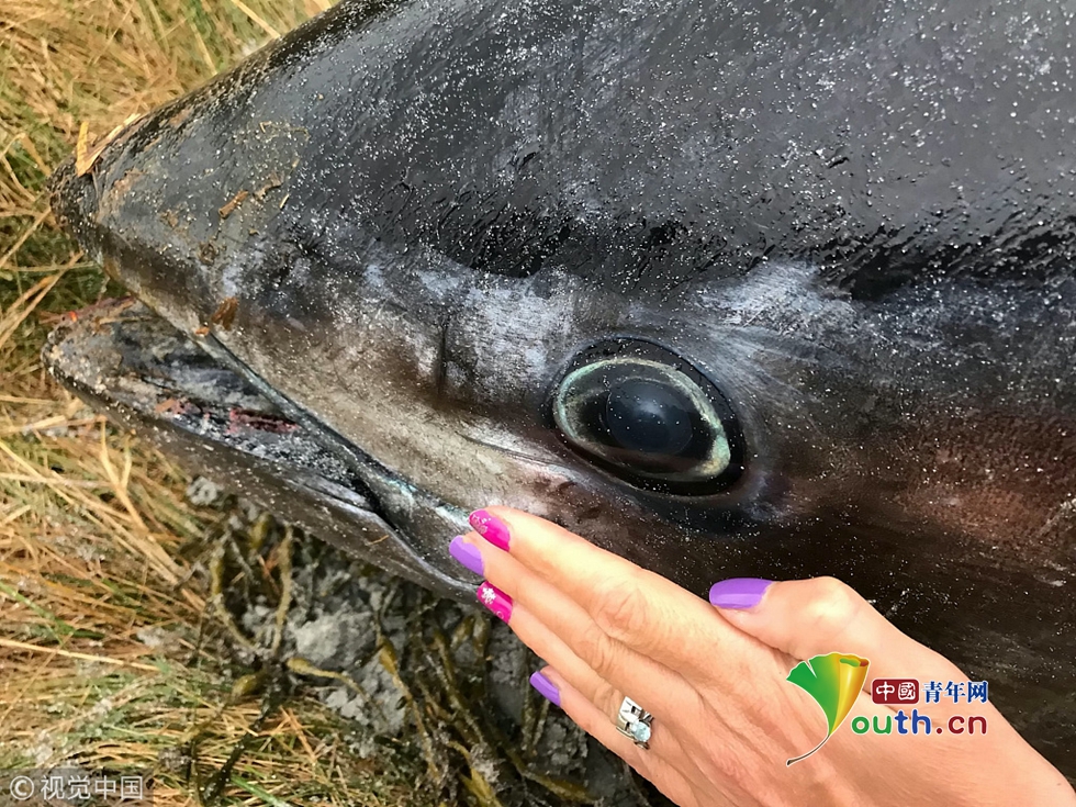 比人還大!狂風(fēng)暴雨后2米長巨型藍(lán)鰭金槍魚擱淺沙灘