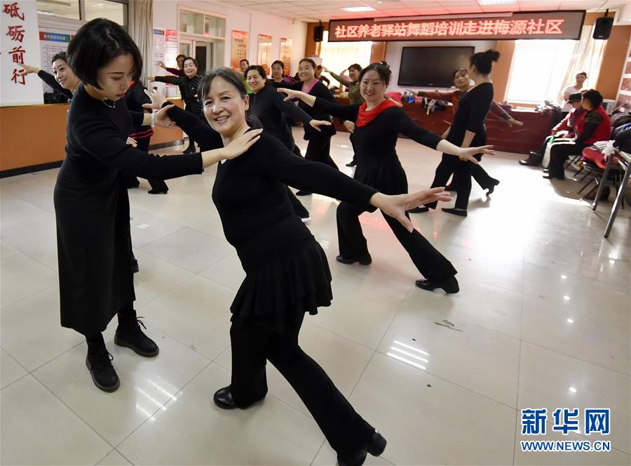 12月17日,豐臺(tái)區(qū)東高地街道日間照料中心的舞蹈老師在梅源社區(qū)組織老年人開(kāi)展舞蹈訓(xùn)練。 新華社記者 李欣 攝