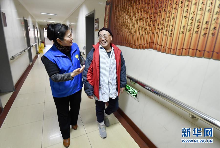 12月17日,豐臺(tái)區(qū)長(zhǎng)辛店街道車輛廠社區(qū)養(yǎng)老服務(wù)驛站的員工陪同她們通過(guò)“連心通”救助的突發(fā)疾病獨(dú)居老人連鐵良(右)做康復(fù)。 新華社記者 李欣 攝