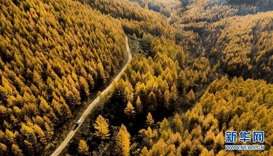 2018年10月8日,一輛汽車行駛在山西省沁源縣好地方林場的林間道路上。 大地之色,俯仰之間;壯美山河,是我的祖國。2018年,新華社記者操縱無人機(jī)“飛閱”華夏大地,在最美的時(shí)節(jié),定格下她的色彩斑斕。 新華社記者 陶明 攝