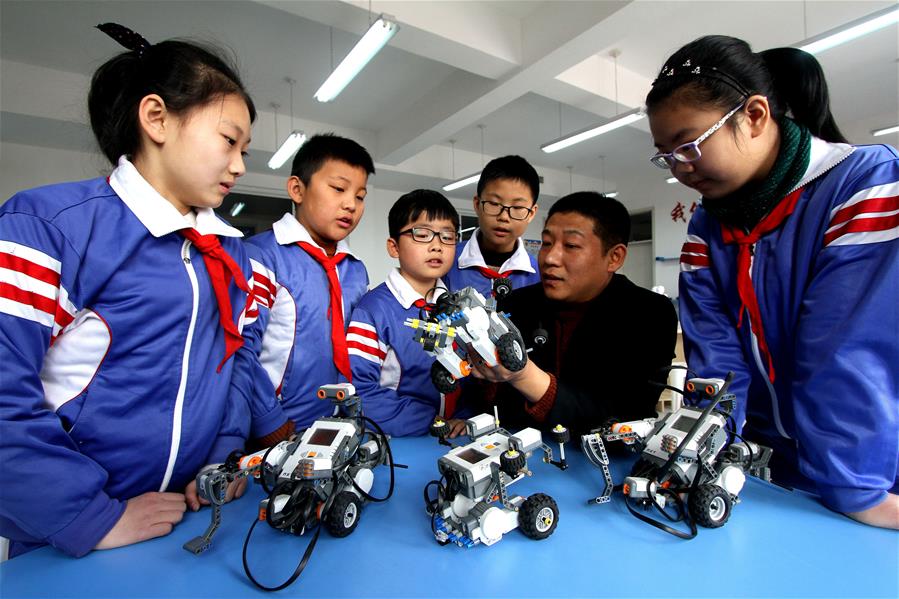 12月19日,武安市淑村鎮(zhèn)白沙學校的老師給學生們講解機器人組裝知識。 新華社記者王曉攝