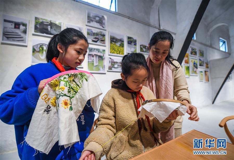 12月20日,學生在舊糧倉改建的“漾西書吧”內(nèi)學習傳統(tǒng)刺繡。 新華社記者 徐昱 攝